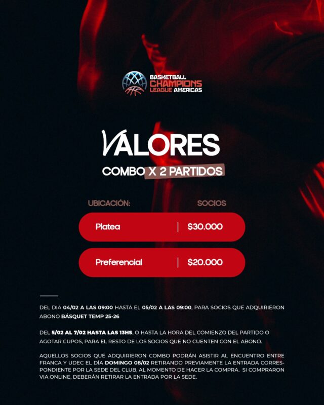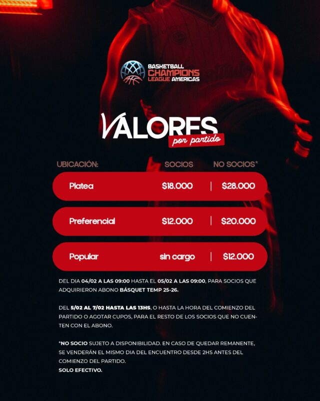 La venta de entradas comenzará el miércoles 4 de febrero a las 9hs y estará destinada, en una primera instancia, a los socios y socias que adquirieron el Abono Básquet Temporada 25/26, quienes contarán con prioridad hasta el jueves 5 de febrero a las 9hs.